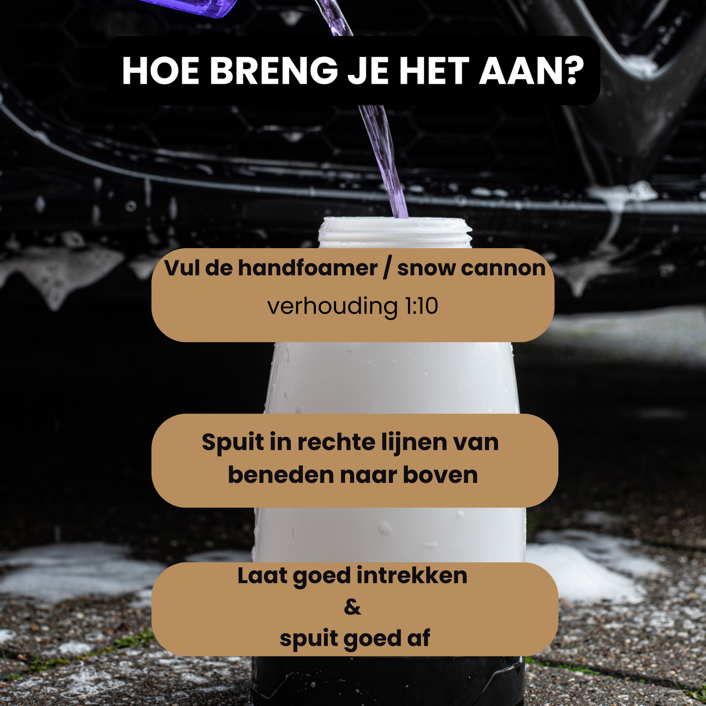 - 75-100 ml snowfoam in de handfoamer en vul met 900 ml water