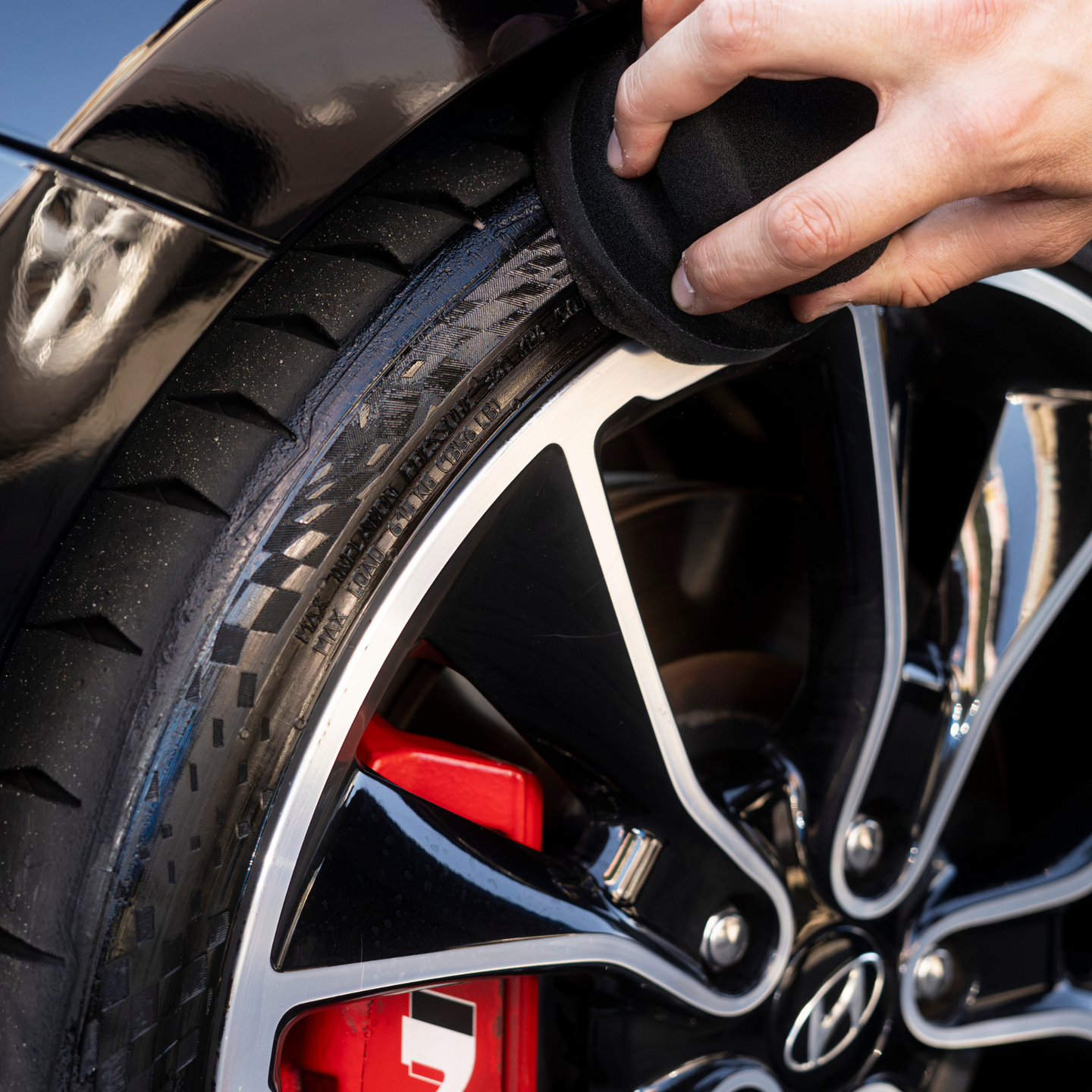 Breng een lichte hoeveelheid tire shine aan op een applicatie spons en verspreid evenredig over het oppervlak
